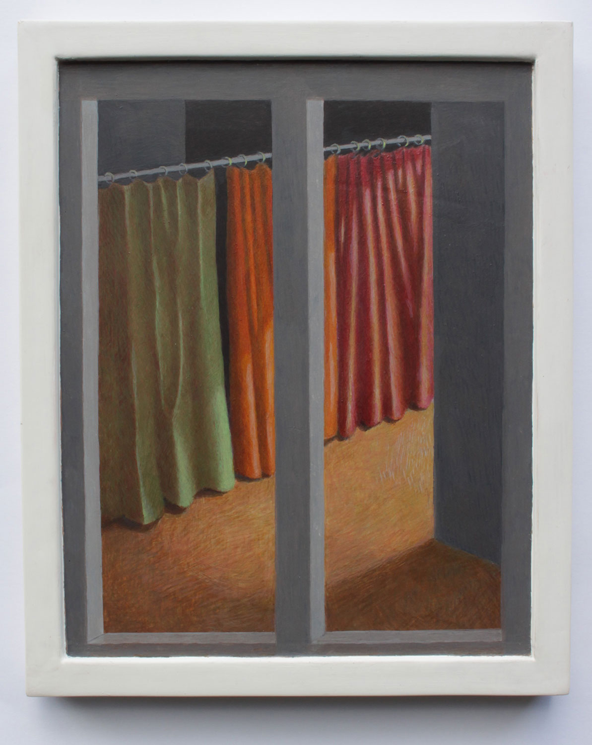 Zavier Ellis’s layering of abstraction, text and collage engages directly with histories of resistance and political conflict. His work is held in the collections of Sammlung Annette und Peter Nobel and Beth Rudin DeWoody, and has been exhibited at Museum der Moderne Salzburg, Pera Museum Istanbul and Torrance Art Museum Los Angeles. Mathew Gibson, former Professor of Foundation Studies at SCAD, Savannah and director of the Winsor & Newton residency programme at Colart, presents an unpeopled interior in egg tempera infused with alienated intimacy.